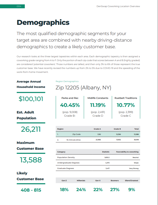 The DenSwap team estimated 30,573 square feet of flexible office space could be supported in the zip code, but a total of 83,000 in Albany. The recommend coworking model is Modern Executive Suite and the suitable property types are office towers, office parks, and shopping centers. t.